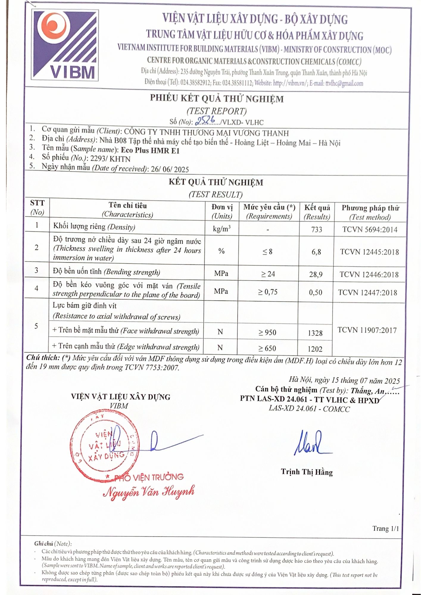 - Ván chống ẩm tiêu chuẩn HMR Eco Plus E1 của Vương Thanh (hoạt chất chống ẩm trong thành phần keo chiếm 21-24%) và có màu cốt là Đen Xám.