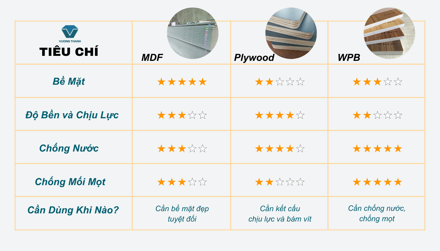 – Lưu ý: Khả năng chịu lực, bắt vít kém hơn MDF và Plywood.