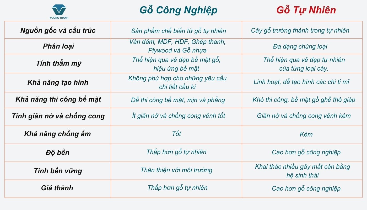 Dưới đây là bảng so sánh tổng hợp giữa gỗ công nghiệp và gỗ tự nhiên những yếu tố so sánh trên: